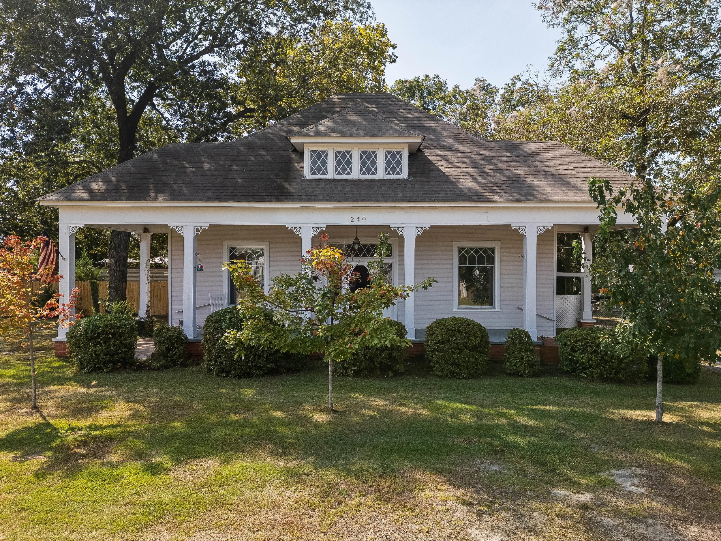 A charming white house with a front porch, surrounded by a green lawn and small trees, with a dark roof and decorative window panes.