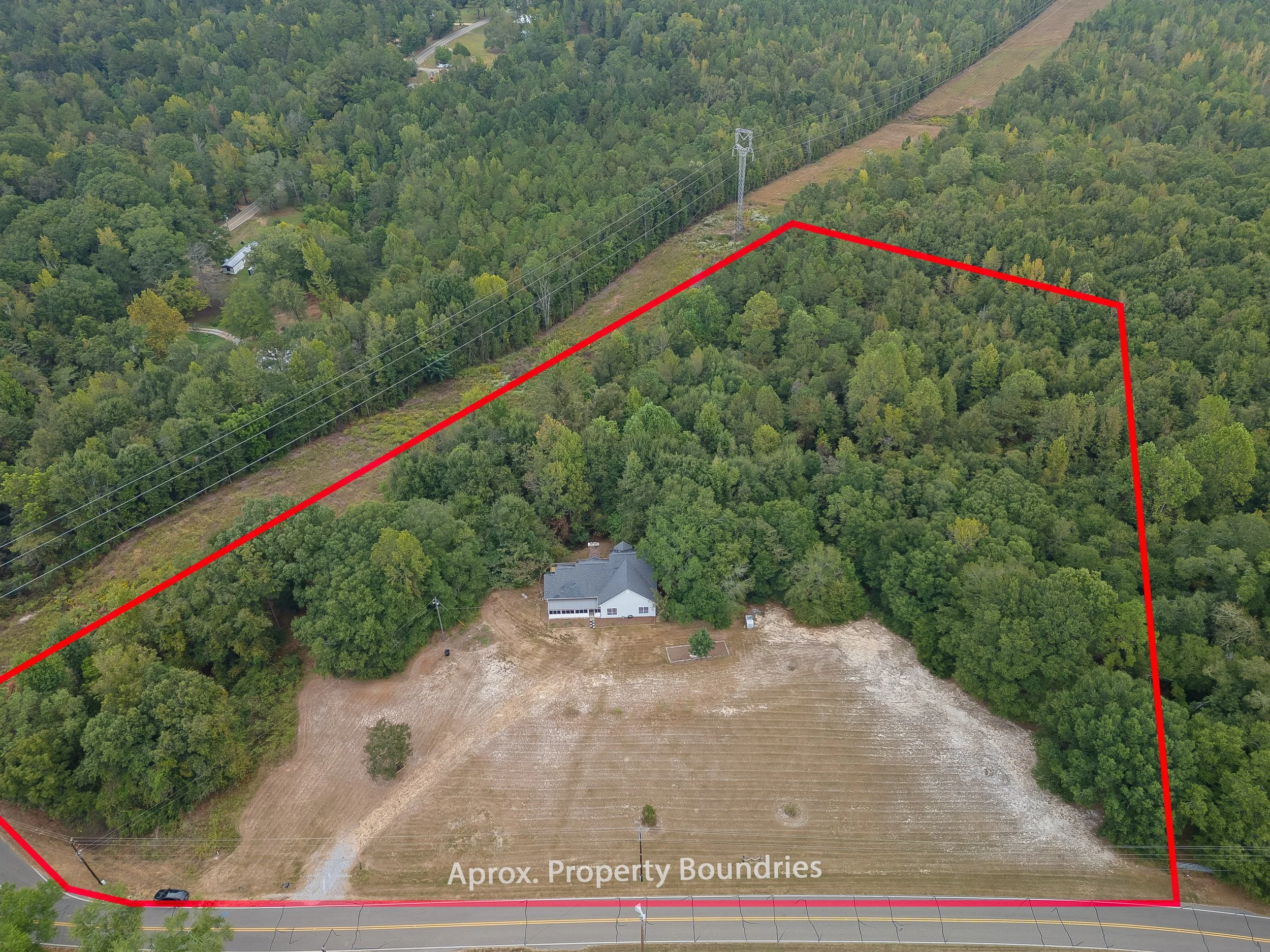 Aerial view of a wooded property with a house and a cleared open area, outlined by red boundaries, alongside a road with visible power lines and a utility pole.